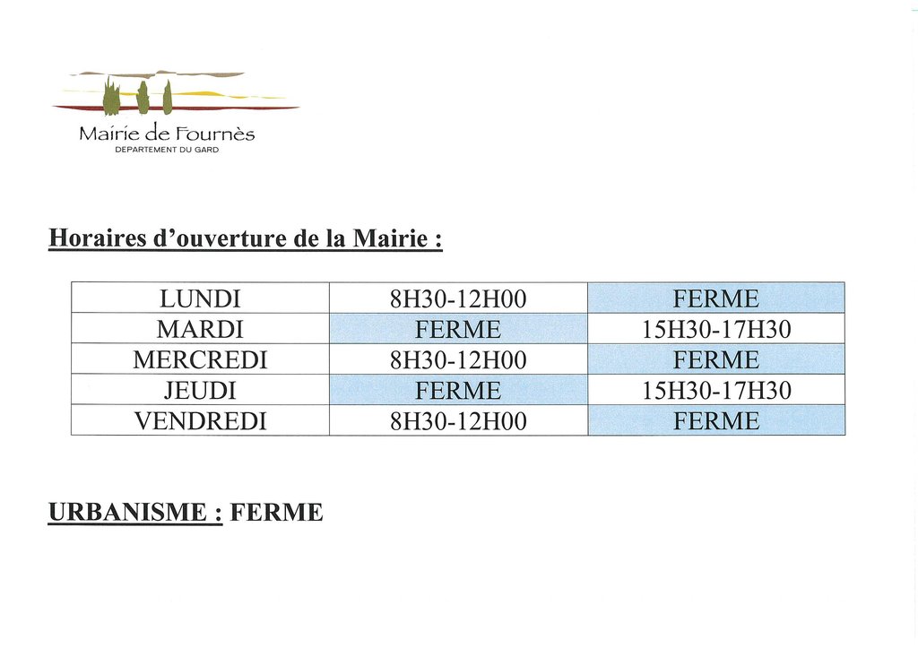 Les horaires d'ouverture de la Mairie aux administrés.