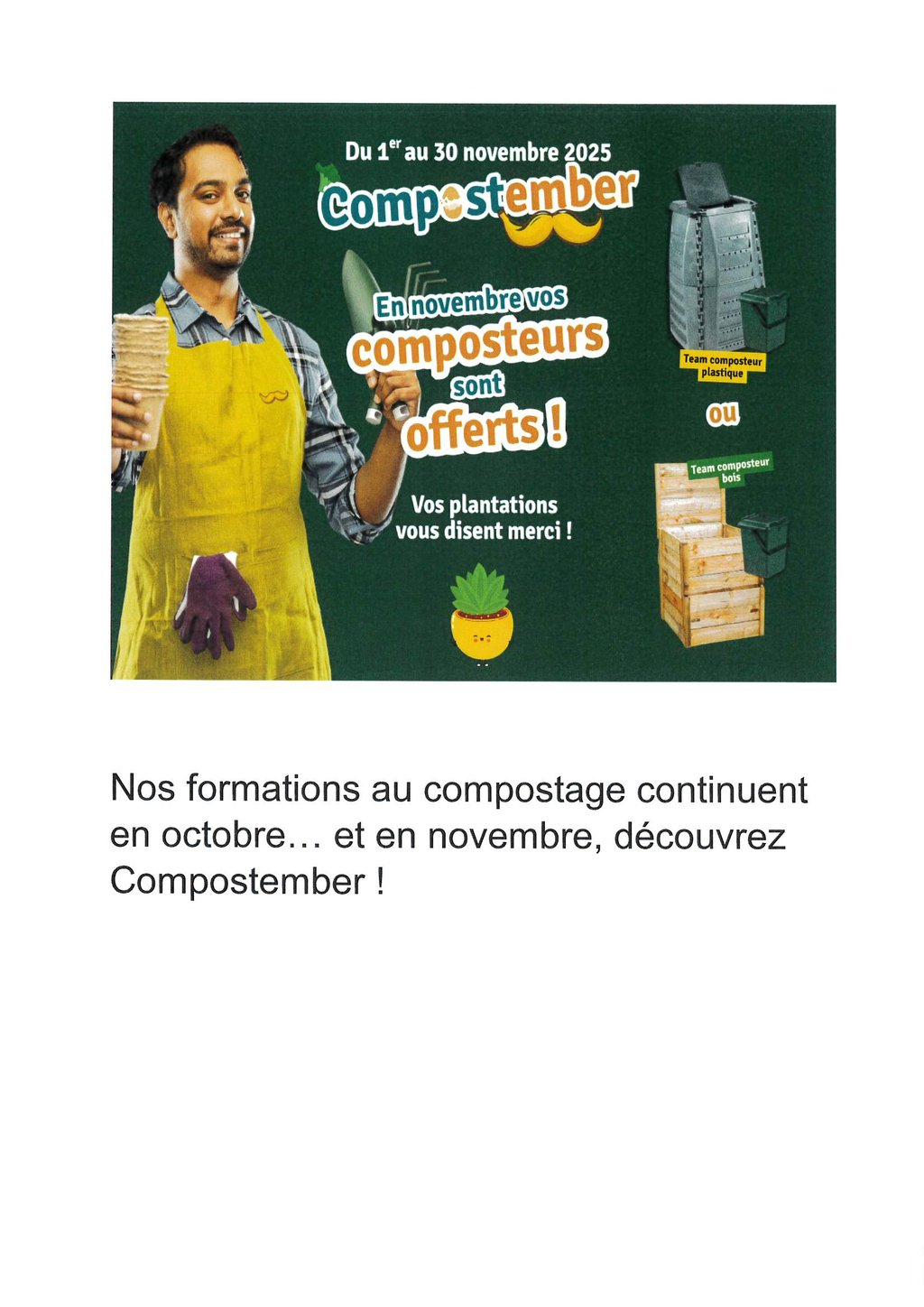 Du 1er au 30 novembre 2025, tous les habitants du territoire pourront bénéficier de composteurs gratuits (bois ou plastique) après une formation pratique de 45 minutes.
