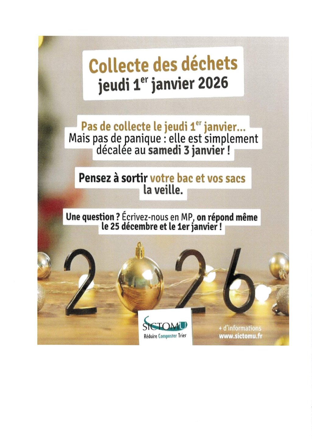 COLLECTE DES DÉCHETS JEUDI 1ER JANVIER 2026